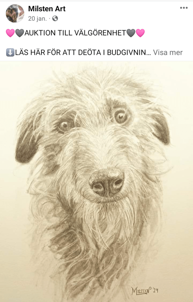 I slutet av varje månad auktionerar jag ut en skiss/målning/illustration där minst 50% av summan går till någon av de utsatta grupperna som jag brinner lite extra för, det vill säga djur och barn. Sedan går resten av summan till frakt och emballage och skulle det bli lite över går det till att köpa mer material (dvs investera i en ny pensel eller färger)